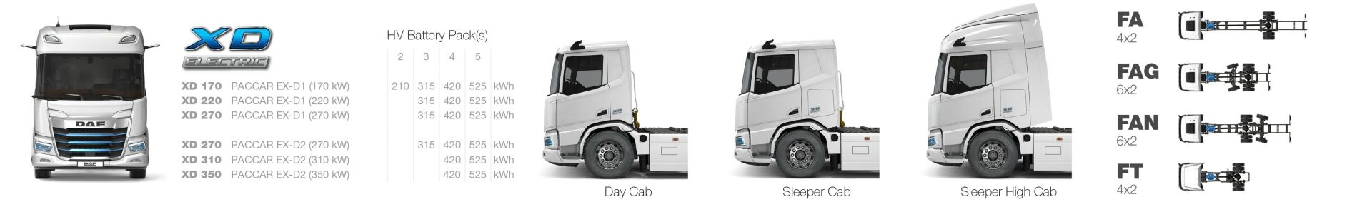 PACCAR EX-D1 og PACCAR EX-D2 elmotorer leverer en effekt fra 170 kW / 230 hk op til 350 kW / 480 hk, og batteripakken har en kapacitet på op til 525 kWh.